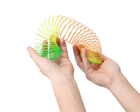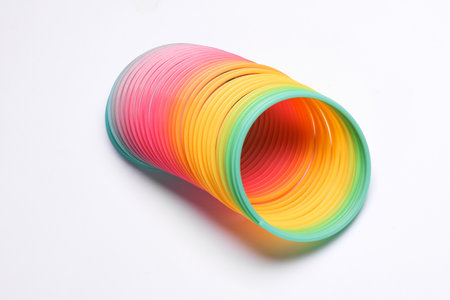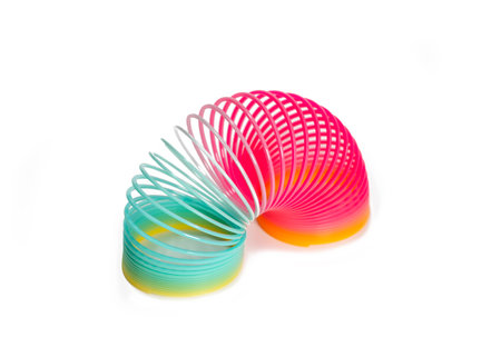 Popular plastic Slinky toy on a white background. A toy in the form of a long multi-colored flexible spring. Antistress toys, development of fine motor skills in children.