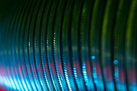 Ridged texture. Color light background. Embossed steel gear wheels. Defocused neon green red blue glow reflection on dark curved corrugated abstract overlay.