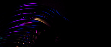 3d render. Abstract dark background with curved lines like tubes twisted in helix and multicolor neon light on tubes. Round composition. Abstract spiral
