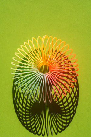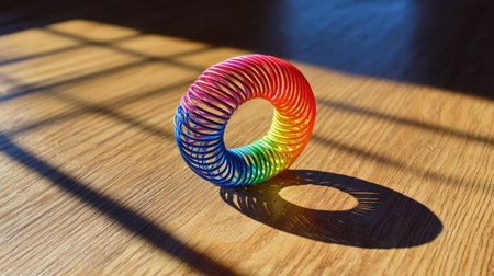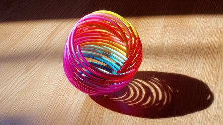 A vibrant and colorful plastic spring toy rests on a wooden floor, casting playful shadows and highlights in natural light, ideal for children