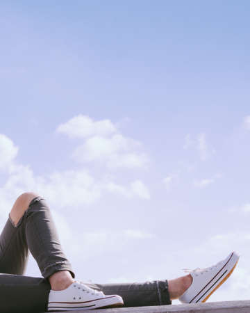Trendy fashionable unrecognizable woman relaxing outdoor wearing casual footwear white sneakers and hole trousers