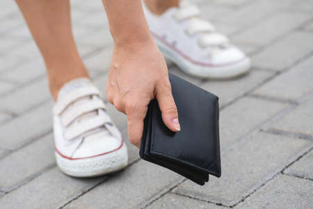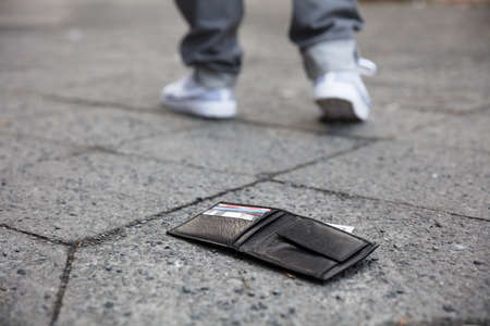 Lost wallet dropped from a woman pocket on the night footpath and is walking away silhouette of woman.