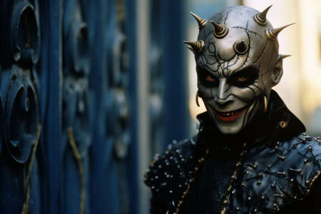 A captivating character wearing a detailed mask with spider web designs stands quietly, gesturing for silence with a finger to their lips during an indoor gathering.