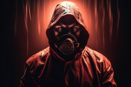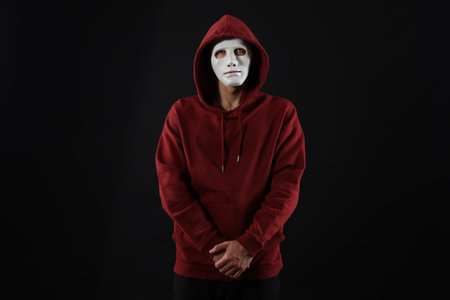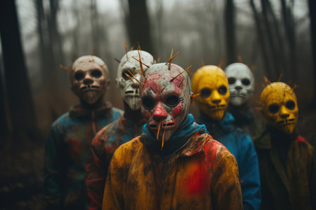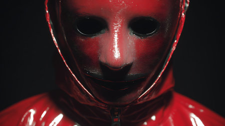 A frightening figure with a disturbing, handmade mask stares from the shadows. The intense look and eerie atmosphere evoke feelings of terror and suspense.