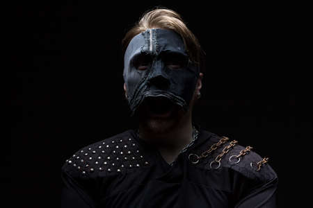 Frightening man in skeleton Halloween cosplay costume. Fashion art design. Guy in creepy skull makeup making faces, showing tongue, trying to scare. Day of The Dead. Black background. Black and white