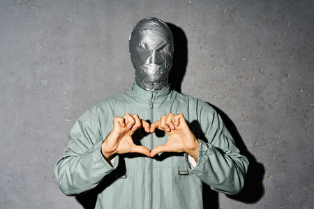 Mystery man with duct tape face showing hand gesture V sign for victory or peace