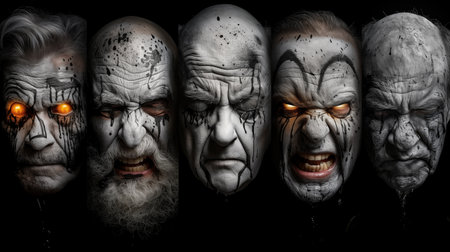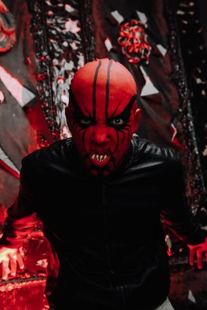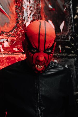 Horror faces and Happy Halloween. Make up and scary concept for man. Halloween holiday celebration - Man demon on black background.