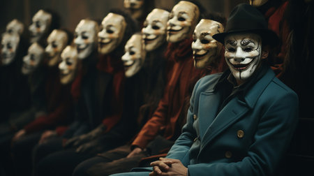 The concept of hidden emotions: a man in a mask smiles at a family meeting, but deep sadness is read in his eyes. Close-up of eyes showing conflicting emotions. Anonymous mask.