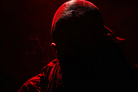 halloween make up. scary person ready for party. man with a false bald head and red demon makeup on his head in black gothic studio.