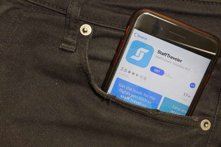 Saint-Petersburg, Russia - 6 December 2019: Mobile phone screen with StaffTraveler icon in pocket close-up, Illustrative Editorial.
