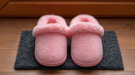 A pair of cozy pink slippers sits on a soft mat, enhancing comfort and relaxation in a warm wooden environment. Perfect for home decor.