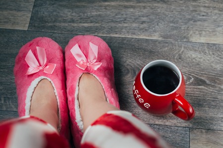 Feet in pink soft slippers and pajamas. Concept weekend.