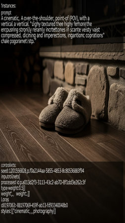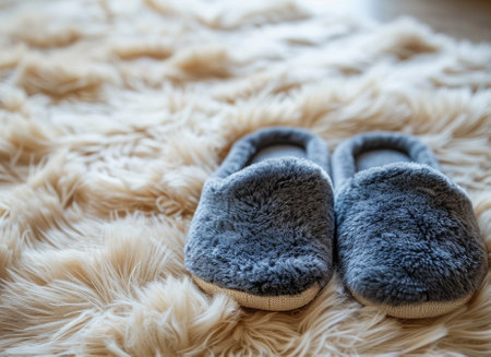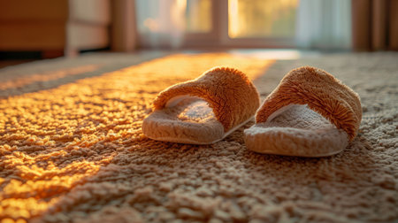 A pair of comfortable slippers resting on a carpet, bathed in warm sunlight, symbolizing coziness and relaxation