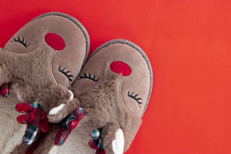 Cozy house slippers in the shape of a deer, New Year's indoor clothes. High quality photo