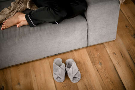 Woman in soft slippers sitting on sofa at home