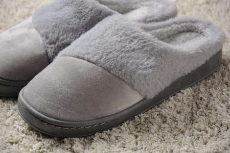A female warm slippers on grey mat. Pair of comfortable slippers