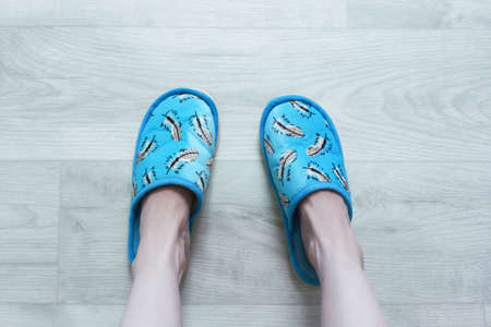 Women's feet in slippers on a white wooden floor. View from above