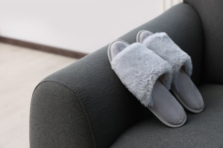 Soft gray slippers on sofa, space for text