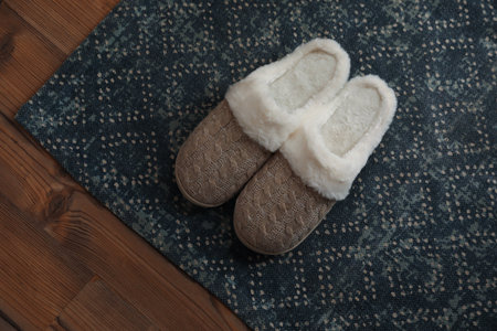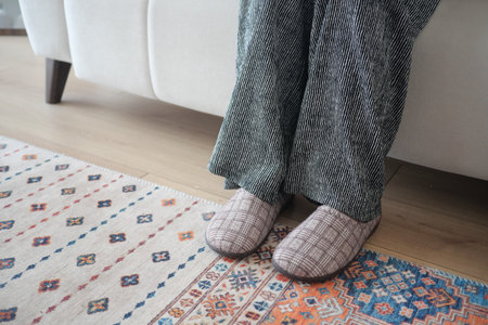 Cozy afternoon at home with comfortable slippers on a patterned rug