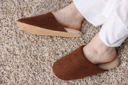 Woman in brown slippers on soft beige carpet, top view