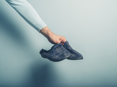 A male hand is holding a pair of slippers