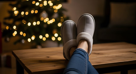 A person relaxes with their feet, wearing cozy grey slippers and jeans, propped up on a wooden coffee table. In the background, a beautifully lit Christmas tree provides a warm, festive glow with soft bokeh lights, creating a serene holiday atmosphere.
