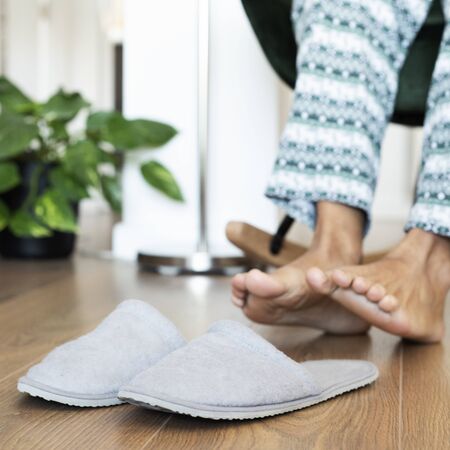 Soft photo of male legs with slippers on the floor, top view. Blueprint