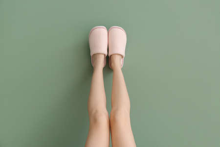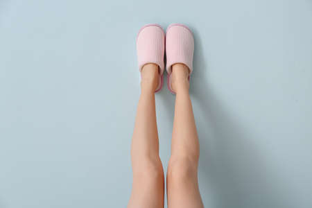 Female legs in soft slippers on color background