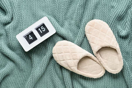 Slippers and alarm clock on fabric background