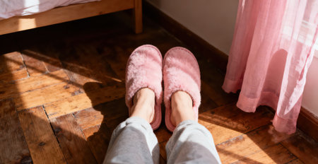 Feet of a woman in pink slippers on the wooden floor