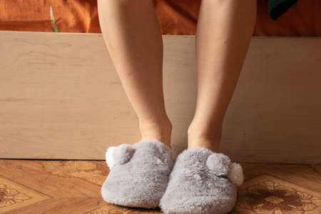 girl's feet in indoor slippers on the wooden floor near the bed, feet on the floor at home, rest