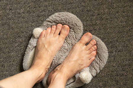 female feet and gray soft indoor slippers on gray carpet, indoor shoes close up
