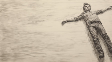 the man stands, gazing downward with animated exuberance. the photo showcases a muted colorscape mastery, with detailed penciling and a motion blur panorama. the artist's use of brunaille underpainting creates an atmospheric effect, complemented by hand-drawn, wispy clouds. ai generated