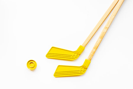 Wooden skis and poles on a blue background. Winter sports. Flat lay.