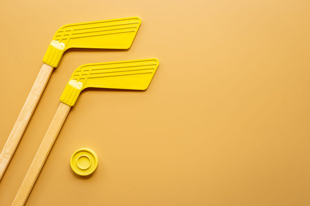 pair of wooden sticks glued with red sticky tape on a blue background, top view