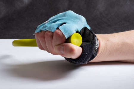 female fist in a bicycle black and blue glove with open fingers holds a green tube, on a black and white background.