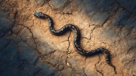Vibrant close up of a snake gracefully moving across the cracked, dry earth of a desert landscape, showing the beauty and resilience of wildlife in arid environments