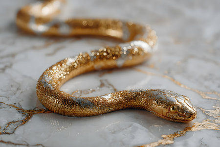 A gold snake embellished with glitter rests elegantly on a polished marble surface, showcasing opulence and luxury. the sparkling details and sleek form create a stunning visual, perfect for artistic and decorative applications. Generative AI