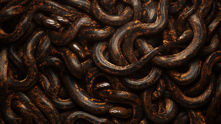 Abstract background with tangled snake, shiny metallic scales texture, unique background for new 2025 year.
