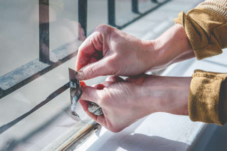 Extreme closeup of female hands holding film strip against light while choosing negatives for printing during photo development process in creative studio copy space