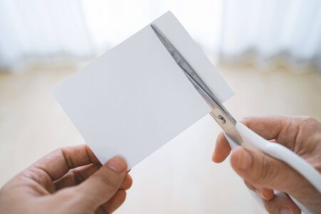 Hands of person cuttung expired credit card with sharp scissors to stop himself spending money on shopping