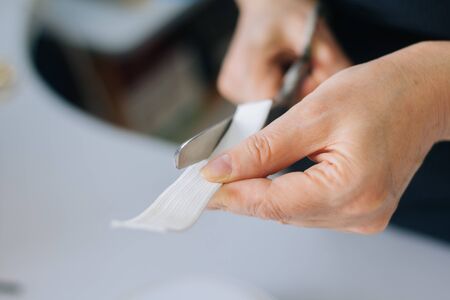 Close-up hands cut with scissors a wide elastic band on thin ribbons.