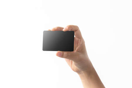 Close up female holds in hand credit bank card isolated on white background. Finance design, currency concept. Copy space for advertisement. Advertising area
