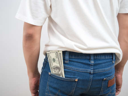 Close up back of man money dollar in trousers jean pocket portrait white background