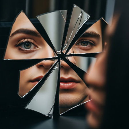 Reflection of broken dreams with shattered mirrors revealing hidden emotions and thoughts of a young woman
