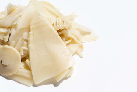Preserved bamboo shoot slices on white background.