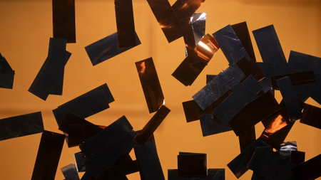 A close-up image capturing shiny confetti falling onto a glossy black surface, illuminated with bright light. This vibrant scene evokes a festive and playful atmosphere, perfect for celebration themes.