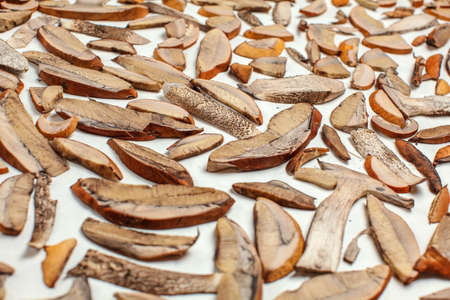 Freshly picked forest mushrooms - orange cup scaber stalk - cut to thin slices, leaved on white paper to dry