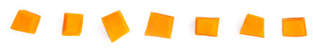 Pumpkin pieces cut in a cube slices isolated on white background. Pumpkins chunks in a row