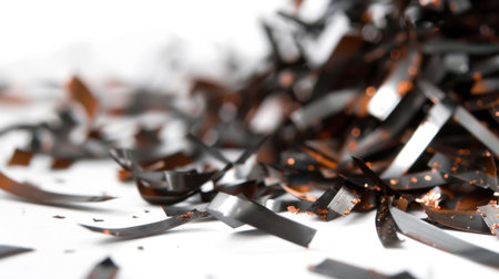 This image features a close-up view of shredded black tape with glossy highlights scattered on a white background, emphasizing texture and intricacies.